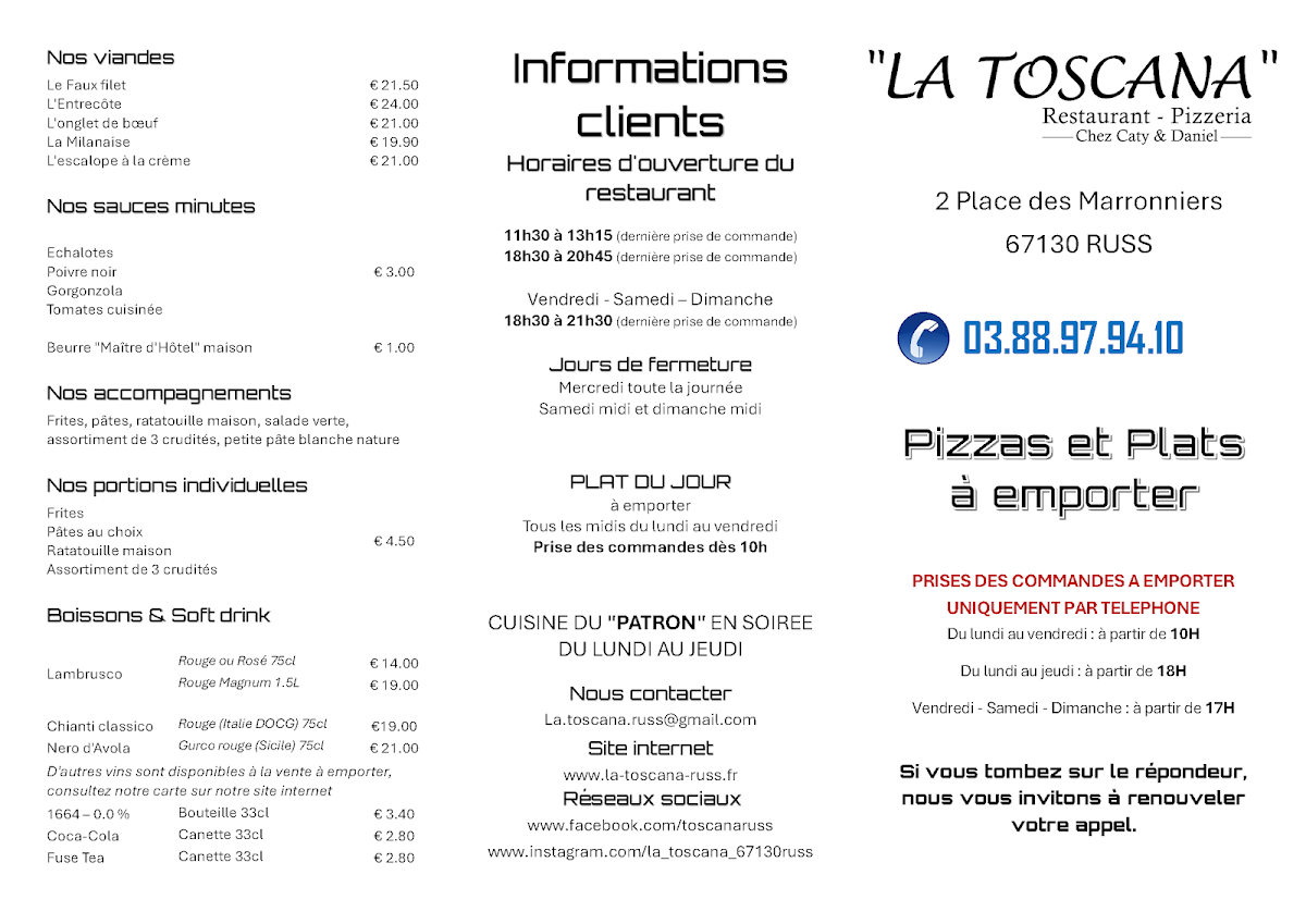 Restaurant - Pizzeria 'La Toscana' Chez Caty et Daniel, nestled in the charming village of Russ, France, is a delightful culinary gem. This vibrant establishment is well-loved for its friendly, professional service and an inviting atmosphere. Patrons rave about the quality ingredients used in their generous pizzas and homemade desserts. The diverse menu features Italian classics, like the standout Gorgonzola linguini, that consistently win over diners. With reasonable prices and quick service, 'La Toscana' is a must-visit for travelers and locals alike seeking authentic Italian flavors and a warm dining experience. Whether you're exploring nearby small towns or just passing through, this pizzeria promises a memorable meal.
